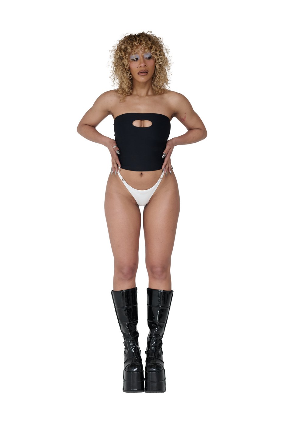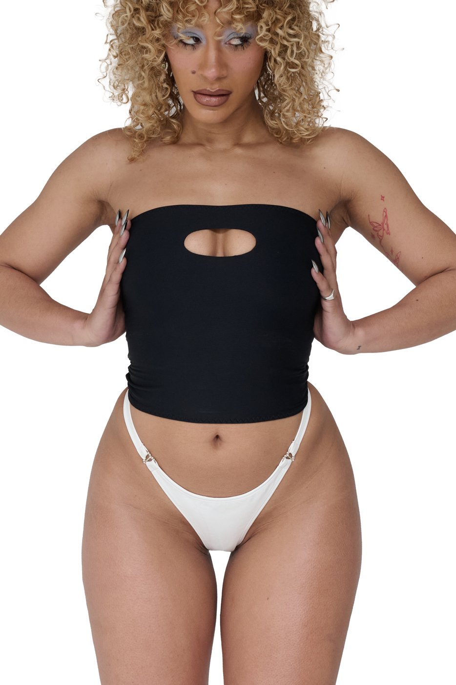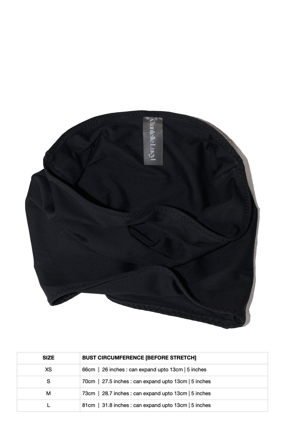 Gloria Tube is a double lined circular cut-out top with a zig zag elasticated bind to compress and shape the bust without wearing a bra. Can be worn for swimming or casually that provides comfort with its seamless finish while being playful. This Tube highlights the frame of the bust with a 4-way stretch making it a generous fit. If unsure of sizing, a measurement chart is available to reference the bust and it is recommended to go down a size for a supported fit. All seams are hidden making this piece feel just as clean and sleek on the skin as it appears on the outside.